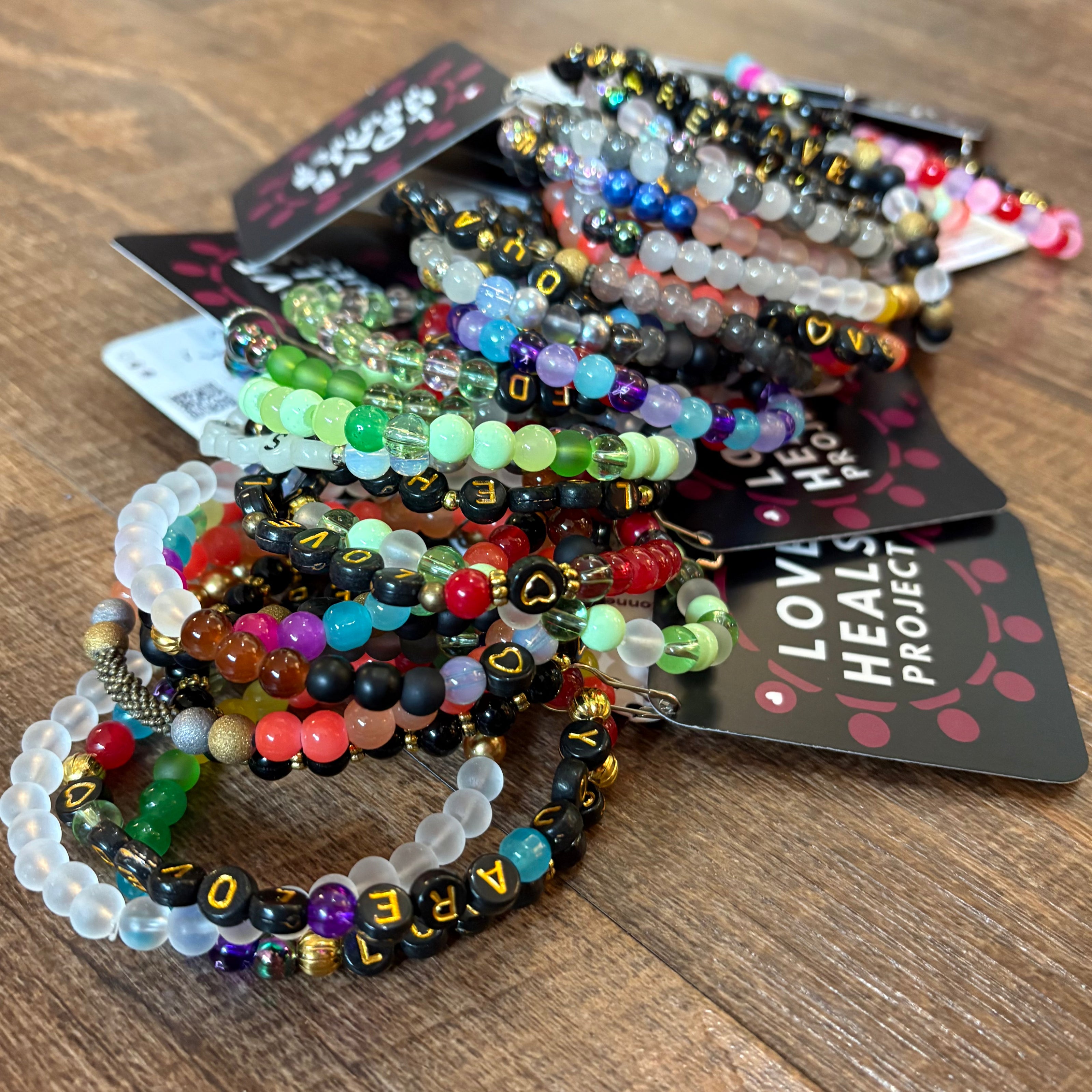 Much like friendship bracelets, they’re about connection. Bracelets are easy to wear, visible on your wrist, and adaptable for many people. Using letter beads, they carry meaningful words - little doses of “word medicine” you can wear - similar in spirit to BRAINBOW’s Mantra bracelets. Love Heals Project bracelets are wearable reminders of our shared humanity, even across differences.